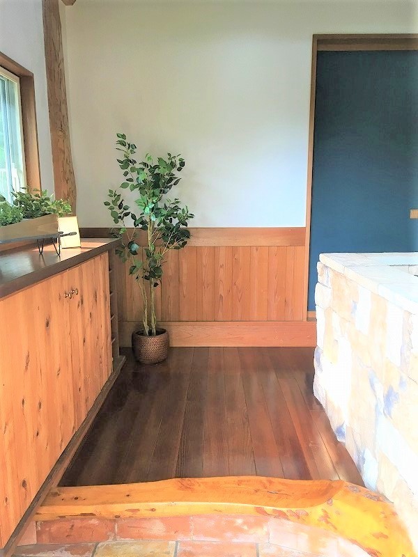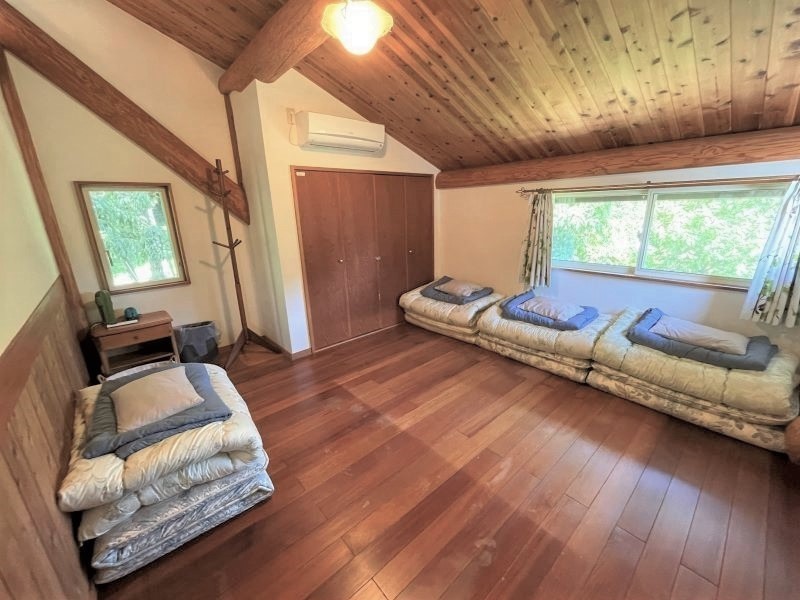 素足に気持ちいい、無垢材のフローリングです。天井は吹き抜けとなっており開放感がありリゾート地の別荘ライフを盛り上げます。寒い時期にはホットカーペットをセットして寒さ対策もいたします。(エアコンは各客室にあります)